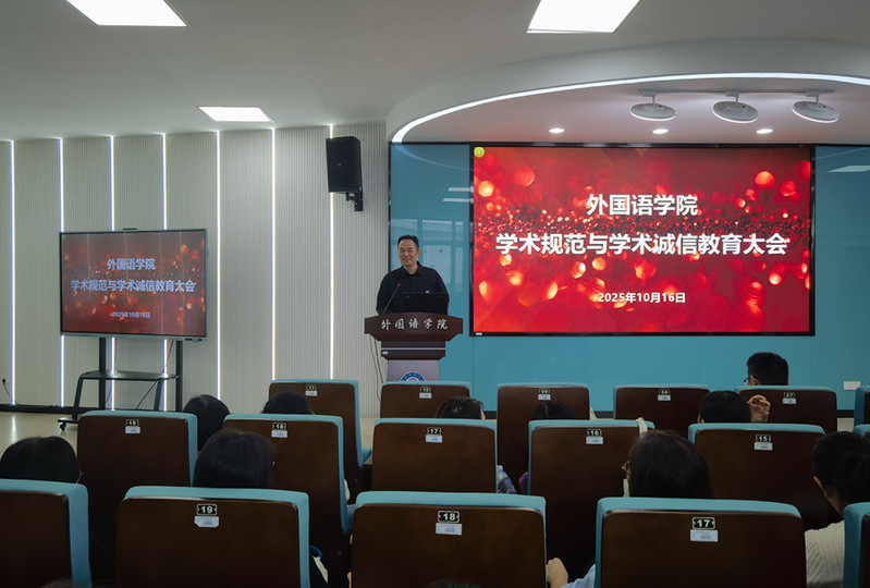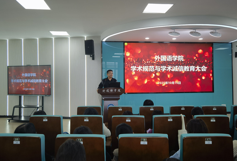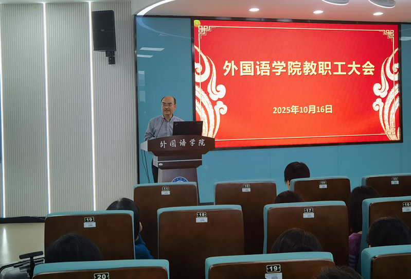 10月16日,外国语学院在圆楼202会议室召开全体教职工大会暨学术规范与学术诚信教育大会。学院党委书记黄佑和主持会议,全体教职工参加会议。
