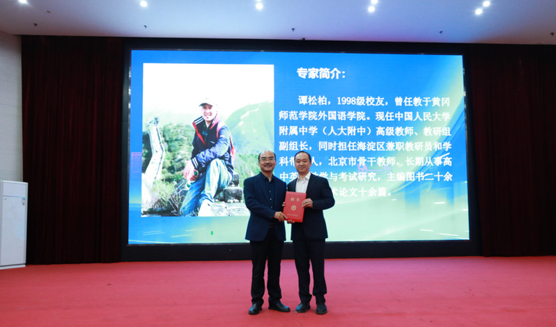 活动现场,院长岑海兵教授为谭松柏老师颁发“黄冈师范学院校友会外国语学院分会副会长”聘书,感谢他长期以来对母校发展的关注与支持,并希望未来进一步加强与基础教育一线的交流与合作,携手推动学院人才培养质量再上新台阶。