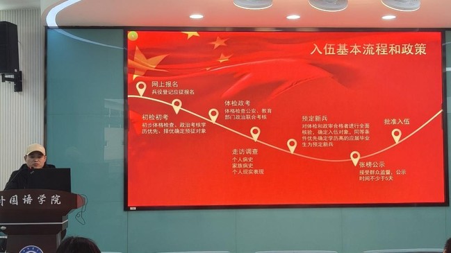 随后,辅导员王军老师为同学们带来了“干货满满”的政策宣讲。他系统梳理了从网上报名、初审初检、体检政考、走访调查、预定新兵到张榜公示的完整流程,并详细罗列了大学生参军享有的学业保障、经济优待以及成长发展等多维度优惠政策。最后,王军老师还发出倡议,鼓舞同学们秉持黄师精神与家国情怀,踊跃参军报国。