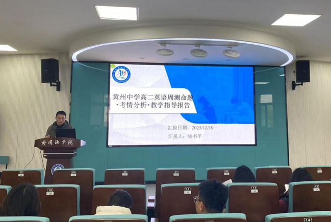 12月17日的讲座以“黄州中学高二英语周测命题·考情分析·教学指导”为主题。喻书平老师以一套完整的周测试卷为切入点,系统解析了试卷命题思路、考点设置与能力指向,并结合真实考情数据,深入剖析学生在不同题型中的常见问题与能力短板。在此基础上,喻老师进一步提出针对性的教学调整建议,生动展示了如何通过考试数据诊断教学成效、反拨课堂教学改进。讲座帮助研究生直观理解了命题与教学之间的内在联系,加深了对教学评价功能的认识。