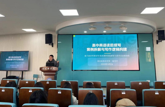 为进一步深化研究生对高中英语教学实践与评价改革的理解,2025年12月17日和12月26日下午,黄州中学英语教师、行业导师喻书平应邀两次走进我院课堂,为2023级学科教学(英语)专业研究生开展专题讲座。两场讲座主题鲜明、内容扎实,分别从英语测试命题分析与读后续写写作教学指导两方面展开,紧密对接高中一线教学实际,受到师生广泛好评。