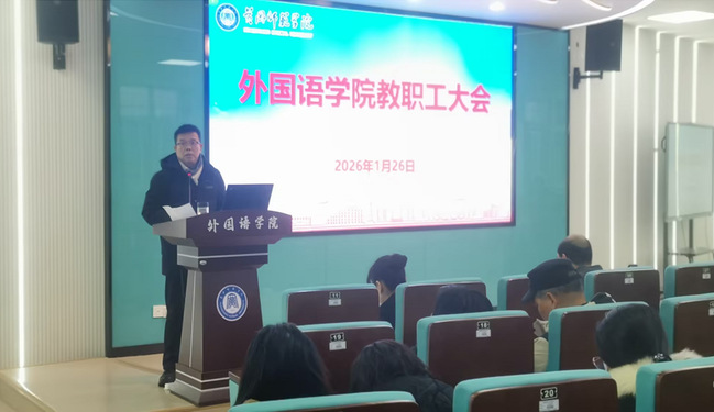 2026年1月26日,外国语学院在圆楼202会议室召开教职工大会。会议由院党委书记黄佑和主持,全院教职工参加会议。