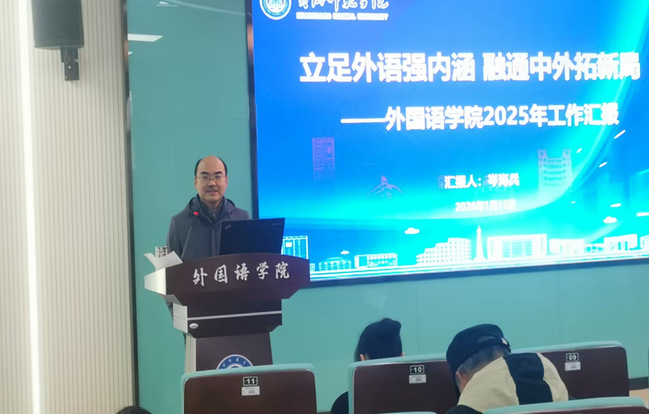 院长岑海兵作题为《立足外语强内涵 融通中外拓新局》的工作报告,总结回顾2025年学院重点工作的完成情况,在深刻分析当前工作形势的基础上厘清了新一年工作的总体思路,擘画发展新蓝图,并统筹谋划学院2026年的工作。他通报了学院2025年终考核结果,从“强基固本,师资队伍迸发活力”“深耕课堂,专业建设提质进位”“凝炼特色,学科生态持续优化”“创新驱动,科研服务双向赋能”“融通中外,国际合作拓宽视野”“协同育人,中外硕士同育提质”“立德树人,学生素养全面提升”等七方面分析了学院的办学实绩。征程万里风正劲,重任千钧再出发!他希望,学院全体师生携手奋进,以实干笃行书写个人和学院高质量发展新篇章。