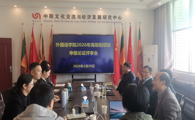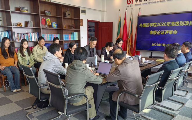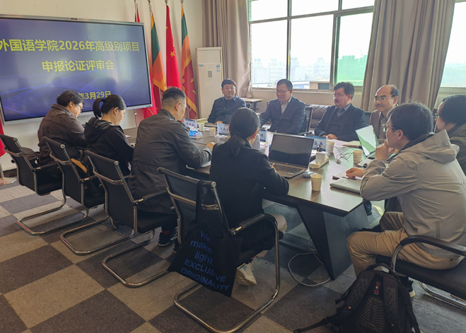 为进一步提升高级别项目申报质量、推进学院高质量发展,3月29日,外国语学院在致远楼805召开2026年高级别项目申报论证评审会,华中科技大学许明武教授、刘久明教授应邀到场指导。学校科研处副处长柯珍堂教授出席会议,会议由我院院长岑海兵教授主持。